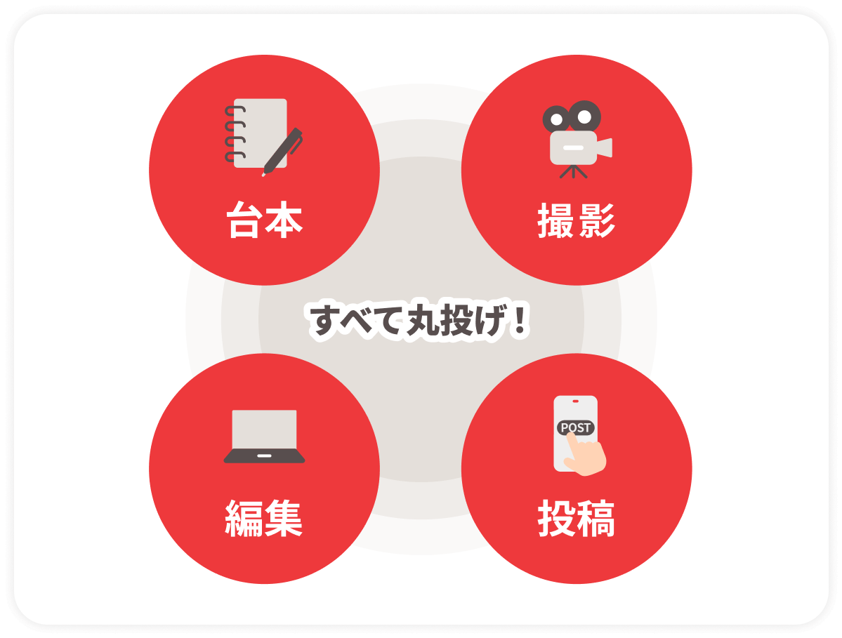 トレンドに合わせた動画、結果にコミットする動画を、プロが一貫して制作・運用します。